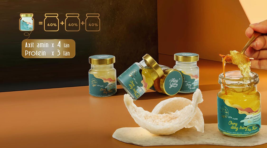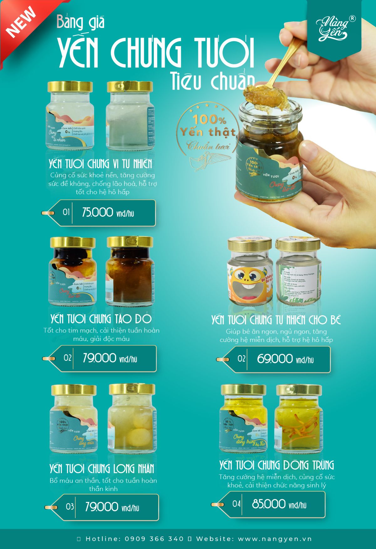 Sản phẩm yến tươi chưng sẵn của Nàng Yến được chưng mới liên tục từ 100% hàm lượng tổ yến sơ mướp nguyên chất, hoà cùng nước dùng thanh mát với đa dạng topping như táo đỏ, long nhãn, đông trùng hạ thảo… Thực khách sẽ cảm nhận được sự tươi mới trong từng sợi yến đong đầy dưỡng chất, và hơn hết đó là cái tâm làm nghề của Nàng Yến mong được trao đi những giá trị sức khoẻ đích thực đến cộng